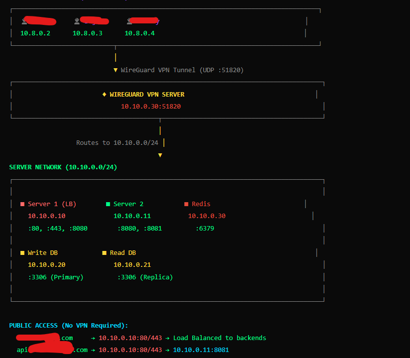 A separate server is allocated to handle Redis, VPN access, and Grafana monitoring, ensuring that critical supporting services do not compete with application or database workloads.